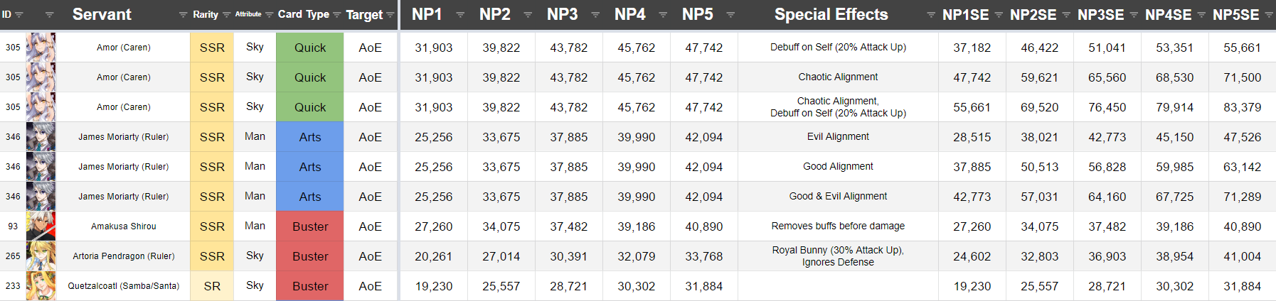 Rat On X The Np Damage List Spreadsheet Has Been Updated With The New Servants Https T Co Xz2m7czjrc 5 Ssr Ruler James Moriarty Aoe Arts 4 Sr Lancer Don Quixote St Quick